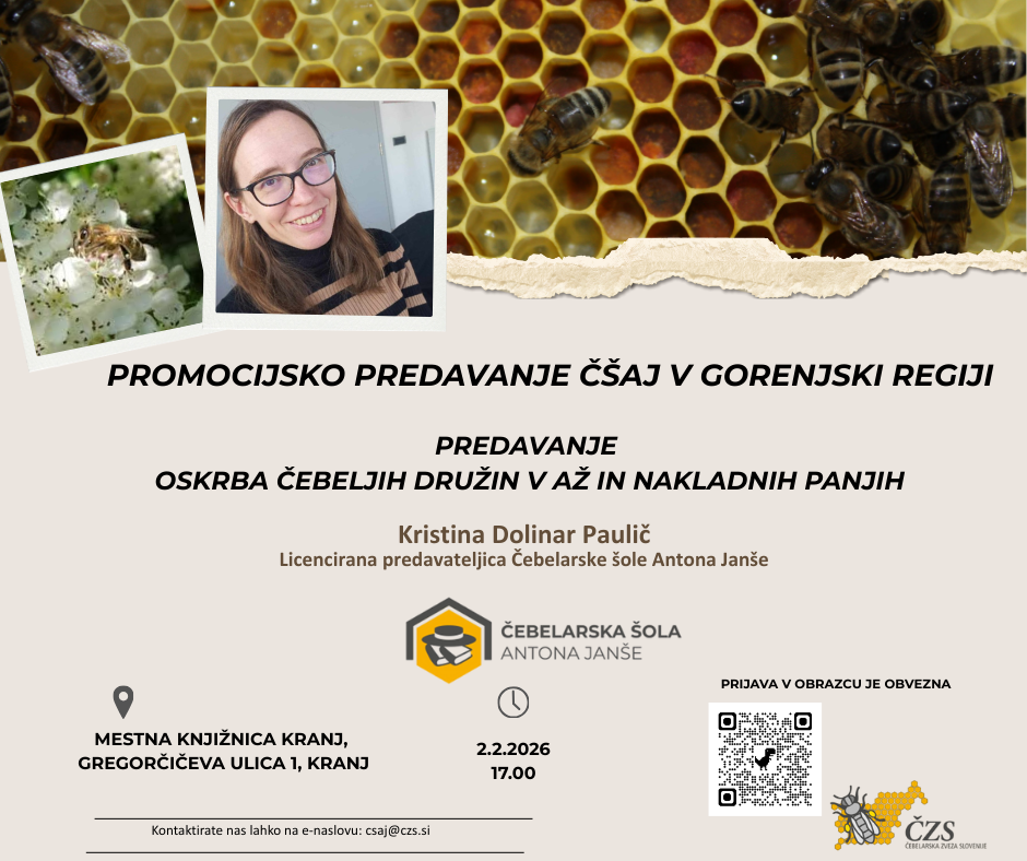 V gorenjskem volilnem okolišu bo 2. februarja 2026 ob 17.00 v Knjižnici Kranj predavala dr. Kristina Dolinar Paulič na temo oskrbe čebeljih družin v AŽ in nakladnih panjih.