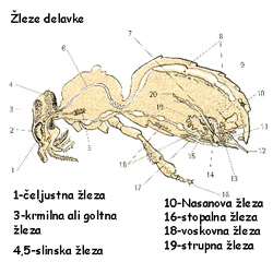 Čeljustne žleze: ima razvite matica, delavke slabše. Izločajo feromone, ki so pomembni pri rojilnemu razpoloženju za oblikovanje grozda, preprečujejo razvoj jajčnikov pri delavkah, omogočajo čebelam spoznavanje matice v družini in ohranjanje socialne skupnosti čebel v okviru družine. Proizvaja tudi 2-heptanon, ki je alarmna substanca.