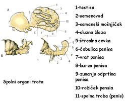 Troti imajo kratek rilček, majhne slinske žleze, nimajo voskovnih, krmilnih žlez, majhne čeljusti, nimajo nasanove žleze,…Dobro imajo razvite strukture, ki so pomembne za orientacijo, let, parjenje. To so: velike oči, bolj razvit optični lobul v možganih, dobro razvit vid in vonj za iskanje matice. Imajo boljšo letalno mišičje. 12-13 dan po rojstvu je proizvodnja sperme zaključena. Spolni organi so: testisa, semenovod, semenski mošnjiček, sluzna žleza, penis.