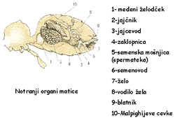 Jajčnik vsebuje od 150-180 jajčnih cevk, ki proizvajajo jajčeca, življenju lahko izleže tudi milijon jajčec. Iz vsake jajčne cevke lahko na dan izleše 8 jajčec, to je 2-3000 na dan. Jajčeca potujejo po jajcevodu mimo semenske mošnjice v vagino in v celico satja. Semenska mošnjica vsebuje spermije, žleza semenske mošnjice oskrbuje spermije. Ko jajčece zapusti jajcevod, se mišice skrčijo in semenska mošnjica se odpre, da spermij oplodi jajčece. Naenkrat se izloči samo nekaj spermijev, kar je pomembno, ker ko ji spermijev zmanjka, jo čebele preležejo in ubijejo. Mošnjica lahko vsebuje več kot 7 milijonov spermijev.