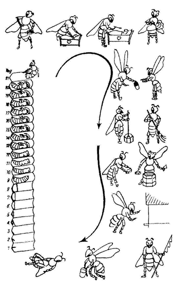 Shematski prikaz razvoja čebele od jajčeca do izleganja in prikaz opravil glede na starost čebel: negovalke, zbiranje vode, čiščenje, gradnja satja, orientacijski poleti, stražarke, pašne čebele in smrt (Tomažin, 2002).
