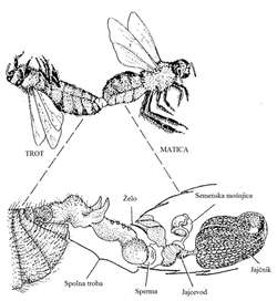 Slika 2: Položaj trotove spolne trobe v nožnici matice med kopulacijo. Ko trot pade nazaj sperma brizgne v jajcevod (Winston, 1987).