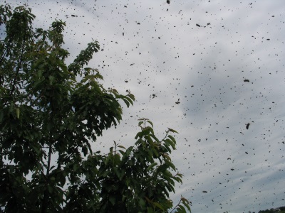 – zadaj na okencu čebele lenobno sedijo. Tudi če vanje pihnemo, zelo malo zašumijo in se takoj umirijo. Kljub morebitni dobri paši ne nosijo, ker jih je že zajelo rojilno razpoloženje.