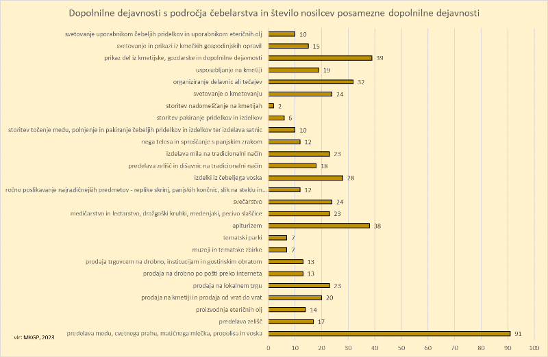 V Sloveniji je bilo v letu 2023 po podatkih MKGP (podatki z dne 30. 6.) na področju čebelarstva registriranih 120 nosilcev dopolnilne dejavnosti. Največji delež čebelarjev, 75%, opravlja dopolnilno dejavnost predelave čebeljih pridelkov, sledu mu dopolnilna dejavnost prikaz del iz kmetijske, gozdarske in dopolnilne dejavnosti, ki jo opravlja 39 nosilcev kmetijske dejavnosti in apiturizem, ki ga ima registriranega kot dopolnilno dejavnost 38 čebelarjev. Najmanj sta zastopani dopolnilni dejavnosti storitve nadomeščanja na kmetijah ter storitev pakiranja pridelkov in izdelkov.