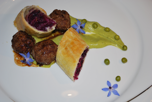 Pikantne goveje kroglice z zavitkom rdečega zelja in hrušk na grahovem pireju z medom