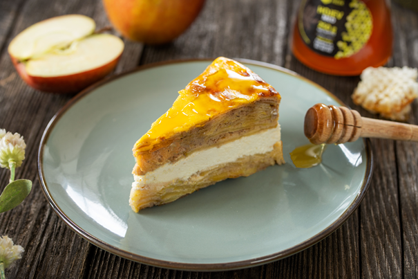 - Počakamo, da se torta v celoti ohladi, jo odstranimo iz modla in postrežemo prelito z medom.