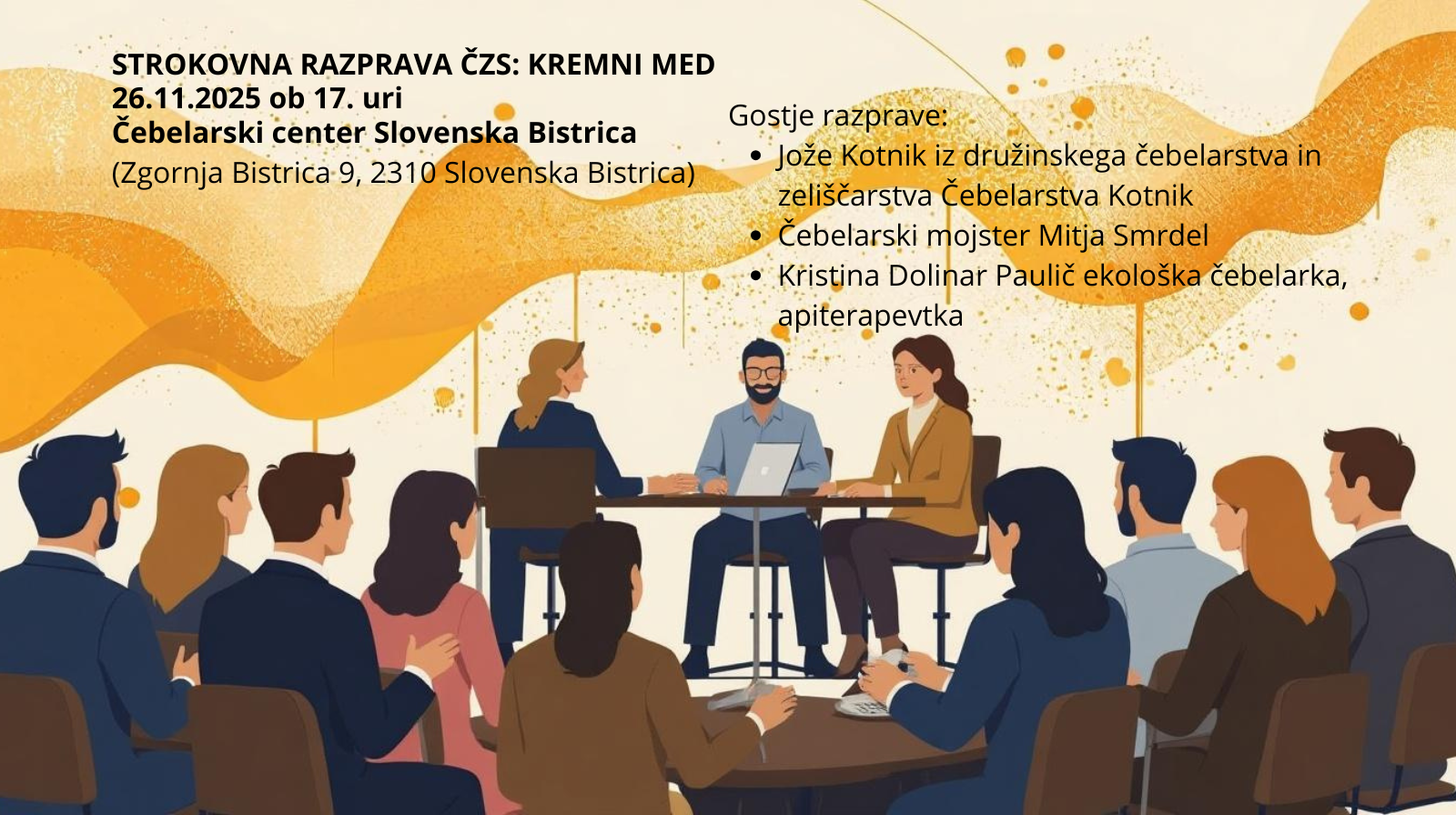 Javno svetovalna služba v čebelarstvu Čebelarske zveze Slovenije vas vabi na strokovno razpravo: KREMNI MED, ki bo potekala 26.11.2025 ob 17. uri v Čebelarskem centru Slovenska Bistrica (Zgornja Bistrica 9, 2310 Slovenska Bistrica).